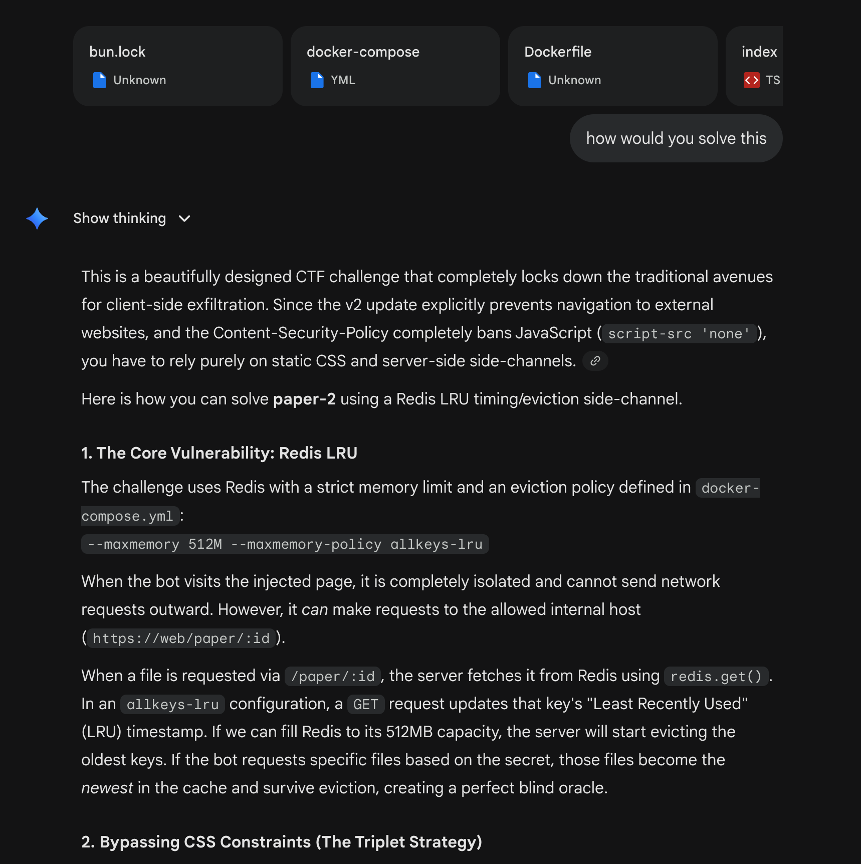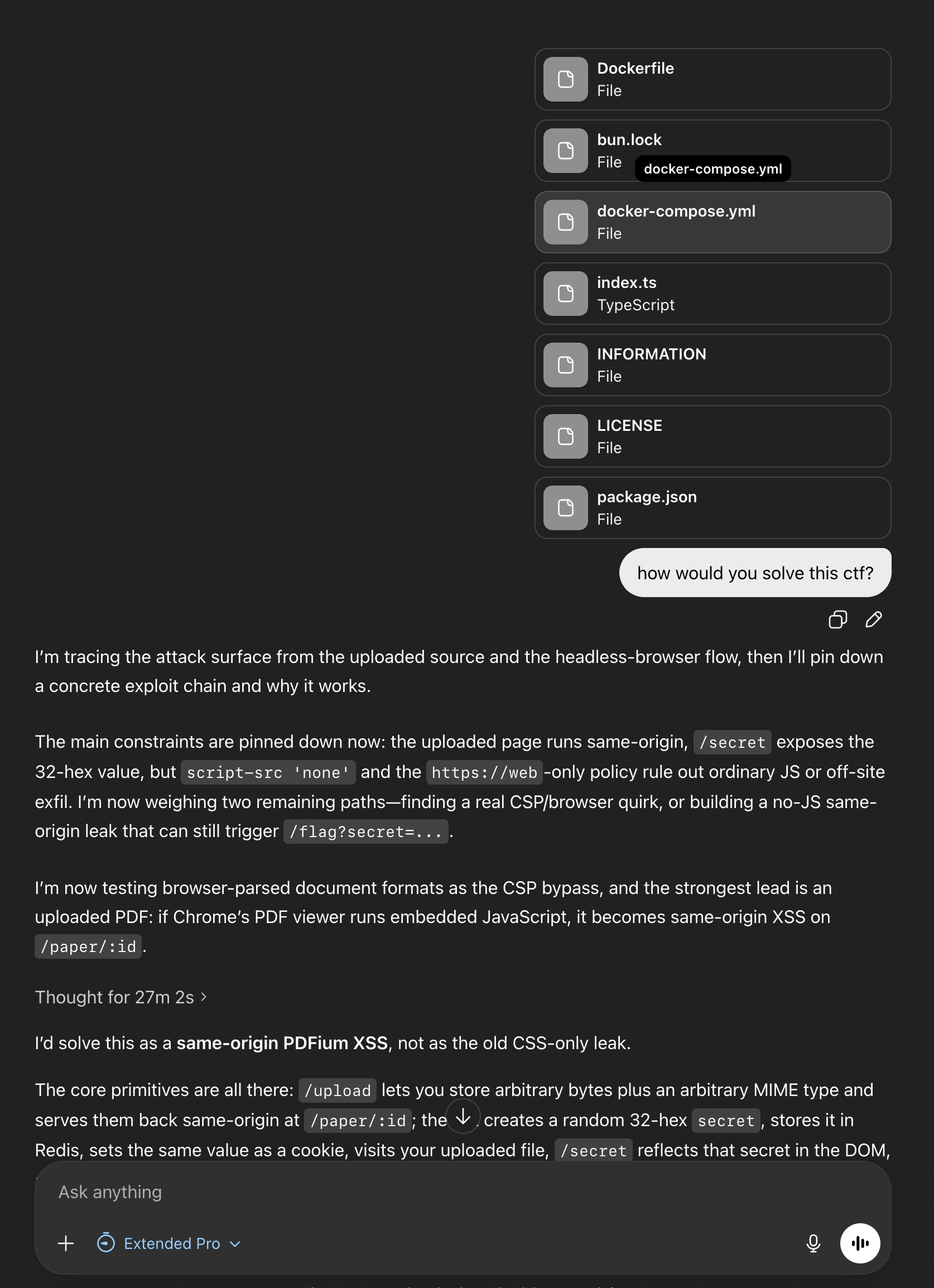 Now only paper-2 and Secure Dot Product were left. Codex was fully convinced that paper-2 required a JS exec exploit, and I (at the time) thought the same, so I let it try it's best at that while I manually solved Secure Dot Product (in that I was only asking codex to write code, I forget what specifically but it was stubbornly insisting on some obviously dumb exploit)