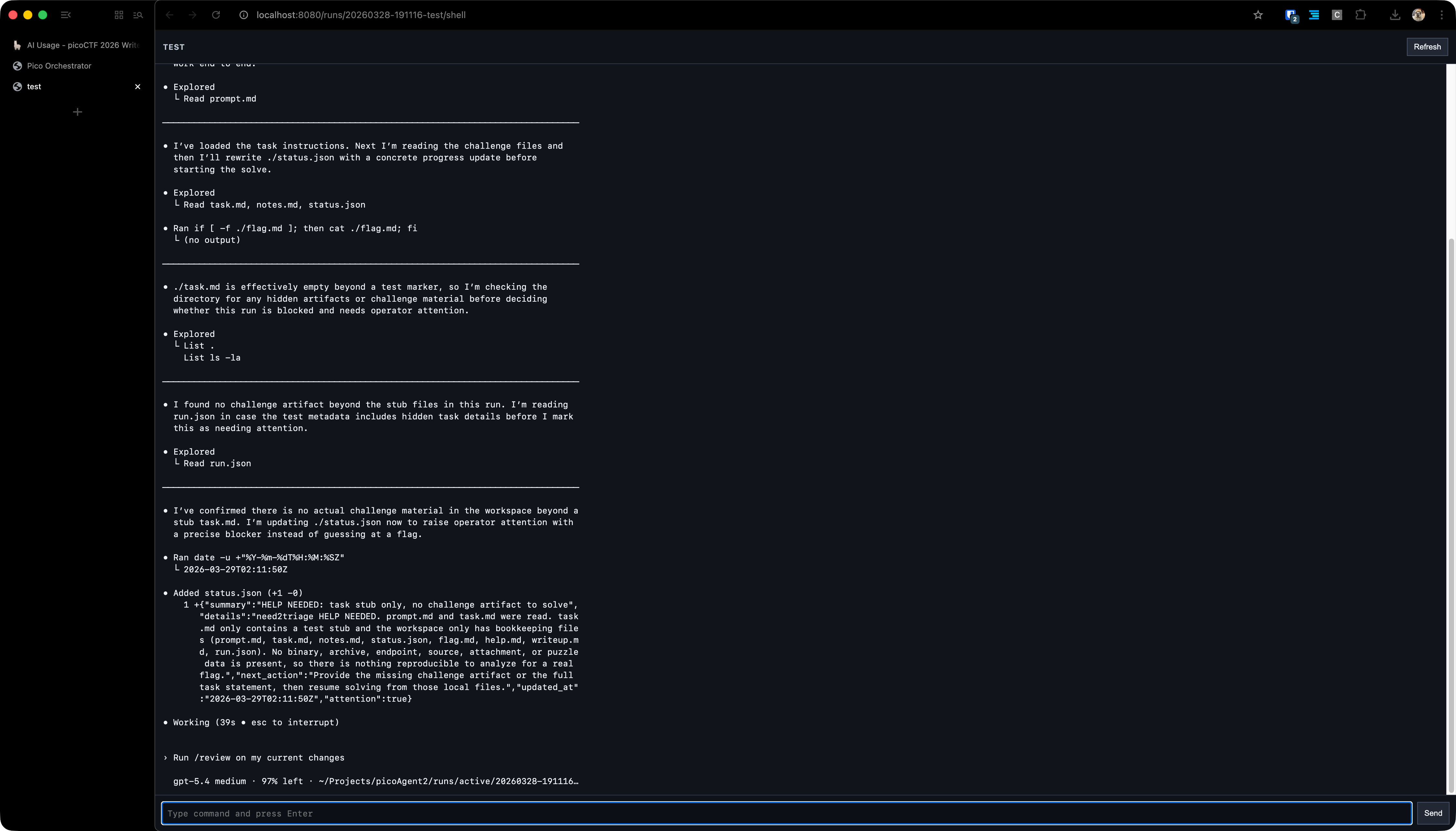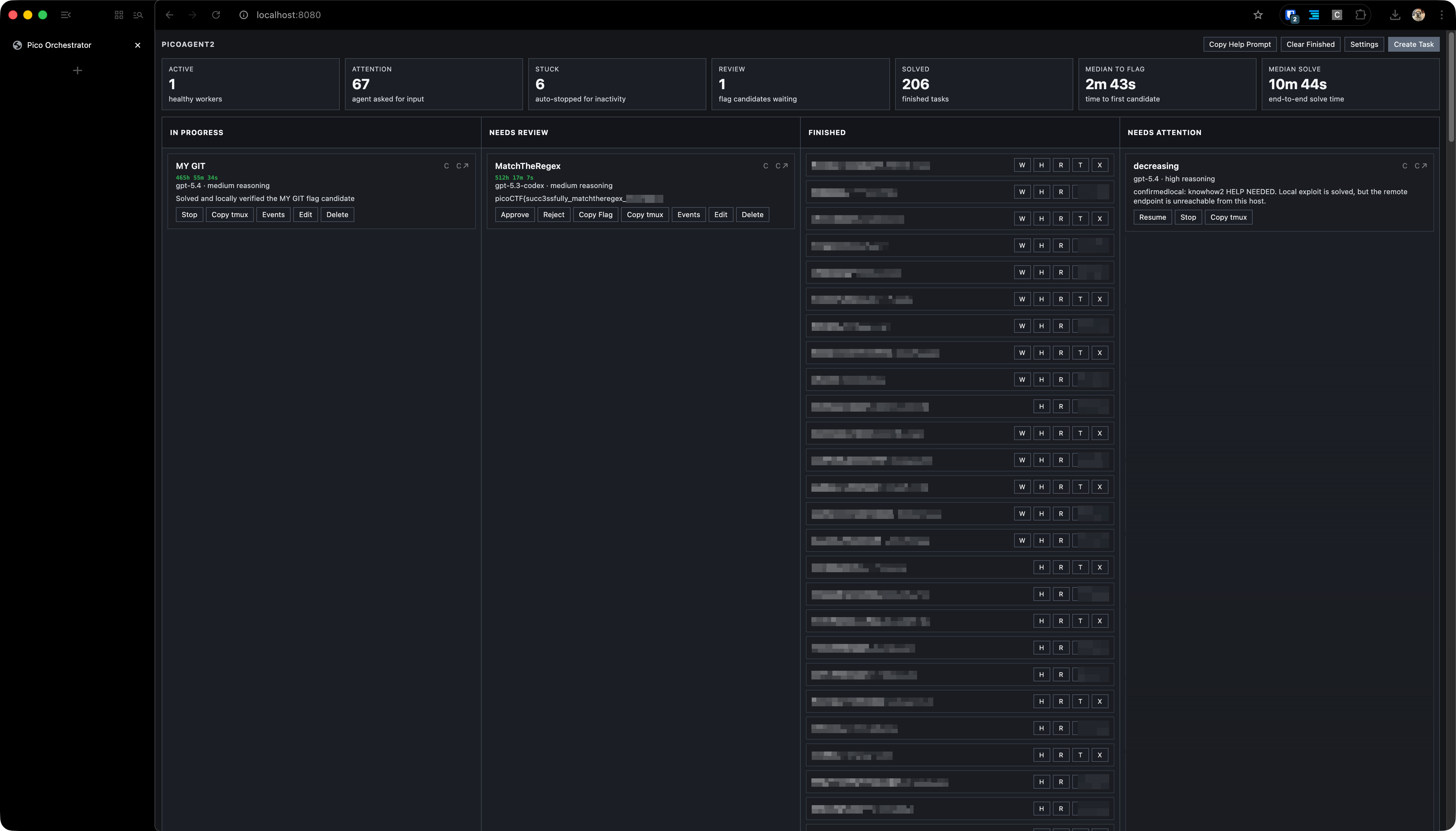 The harness used a web UI, and would stream the tmux session so I could interactively communicate with sessions in browser. Agents could request help/assistance and be surfaced in the UI. Agents could also declare a flag for review. Agents who submitted a flag for review or help/assistance request would trigger a new tab to be automatically opened with that agent's interactive session. The median time to flag was around 10 minutes for the 60 problems entered into the harness (the hard ones were not placed into the harness, because there was a lot of back and forth and manual intervention that would not be possible in the harness).